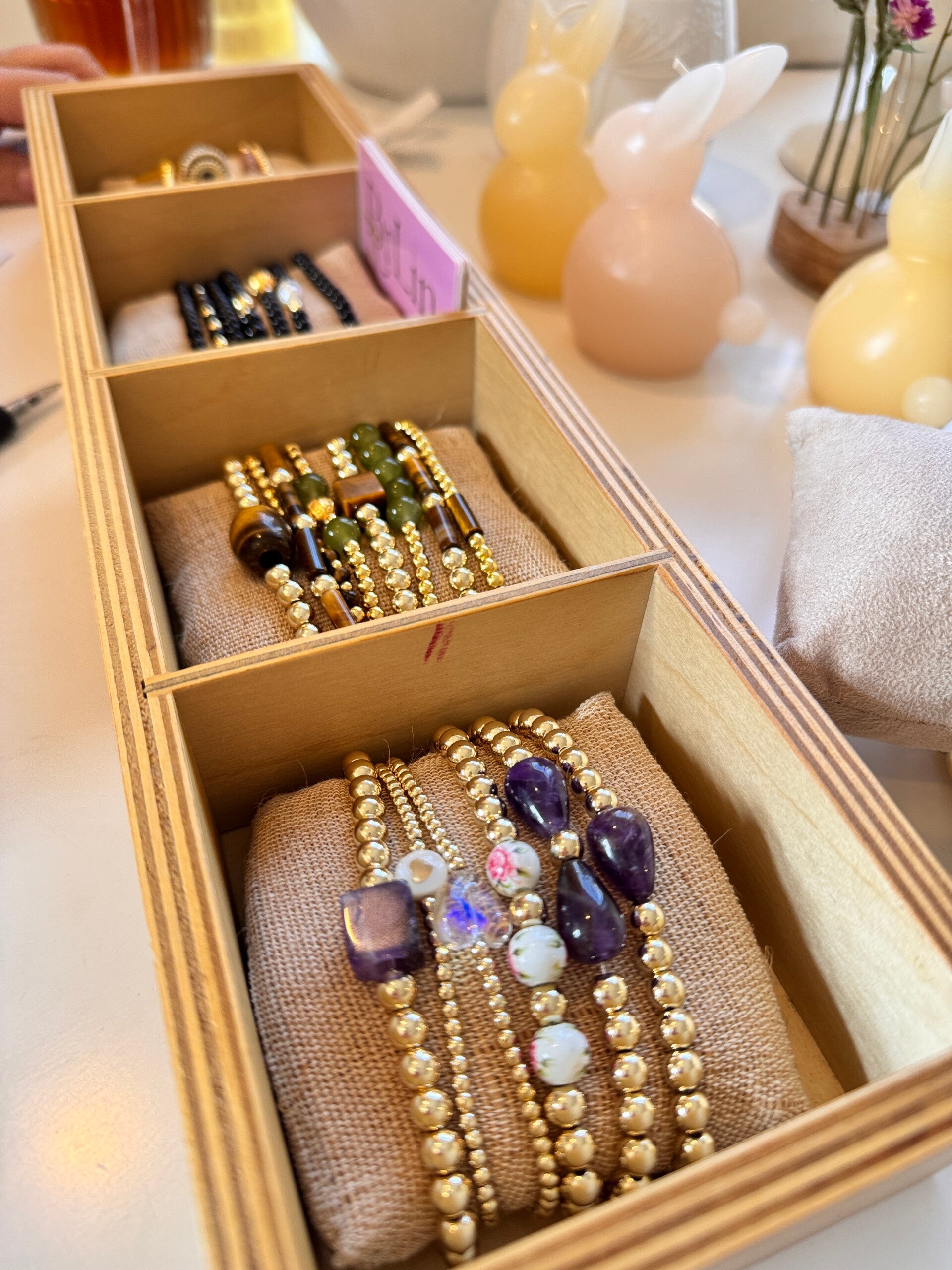 Ontdek onze handgemaakte armbanden met parels, natuursteen en 14K gold plated kralen.