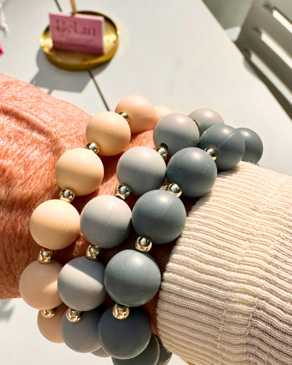 deze verfijnde armband bestaat uit mat blauwgrijze acrylkralen, afgewisseld met subtiele 14k goldplated kralen. de combinatie van koel blauwgrijs en warm goud zorgt voor een tijdloze, elegante uitstraling. ideaal om solo te dragen voor een rustige look of te combineren met andere armbanden voor een speels effect.