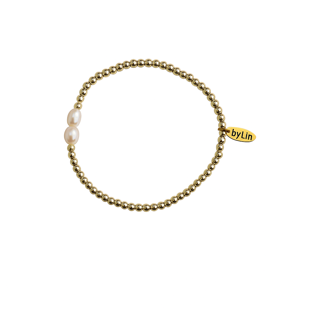 De 3 mm 14K goldplated kralen geven een warme glans, terwijl de twee zoetwaterparels zorgen voor een subtiele, elegante balans. Handgemaakt met zorg en elastisch voor een perfecte pasvorm. Een verfijnd sieraad dat moeiteloos bij elke stijl past.