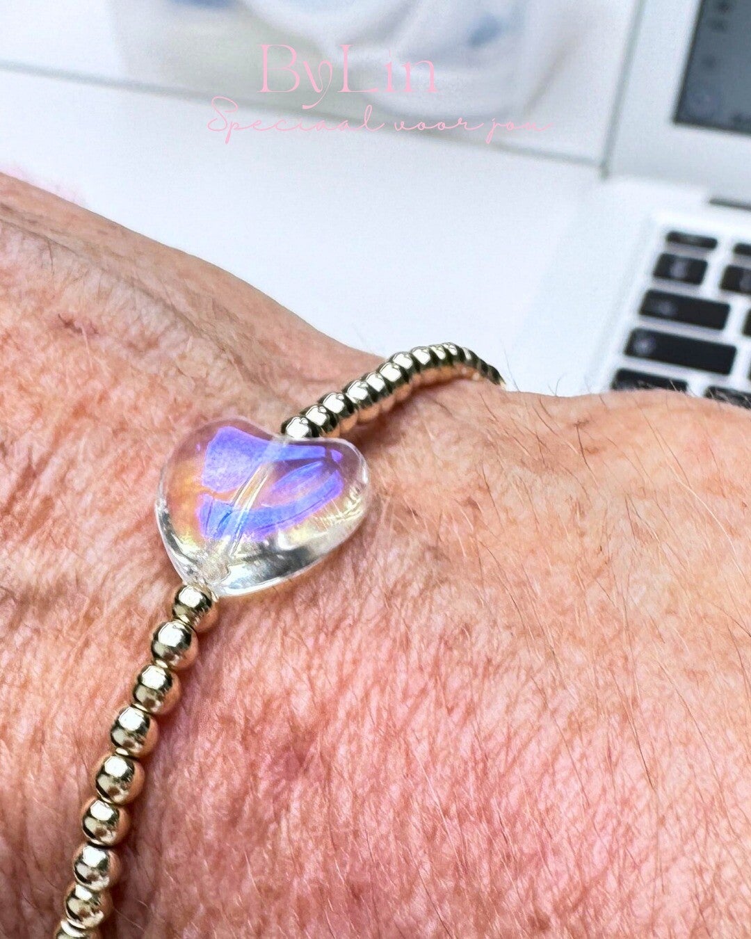 Glazen hart armband met goldplated kralen en transparant iriserend hartje voor een heldere stijlvolle uitstraling.