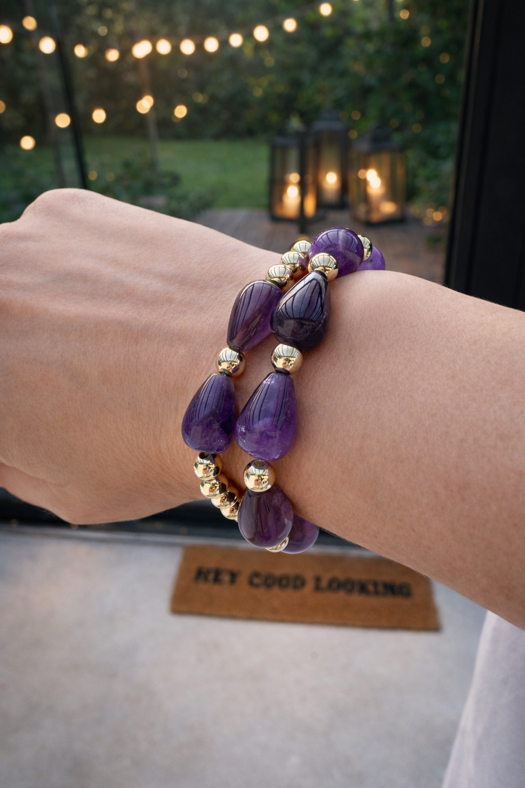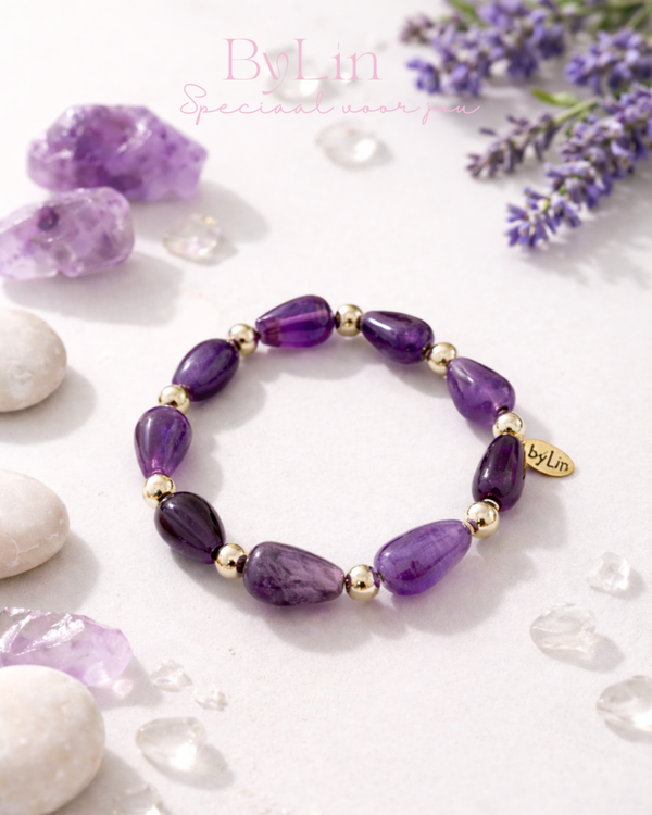 Deze armband is gemaakt van amethist natuursteen in verschillende paarse tinten, gecombineerd met subtiele 14k goldplated kralen. De organische vorm van de stenen geeft de armband een rustige, luxe uitstraling met een krachtige uitstraling.