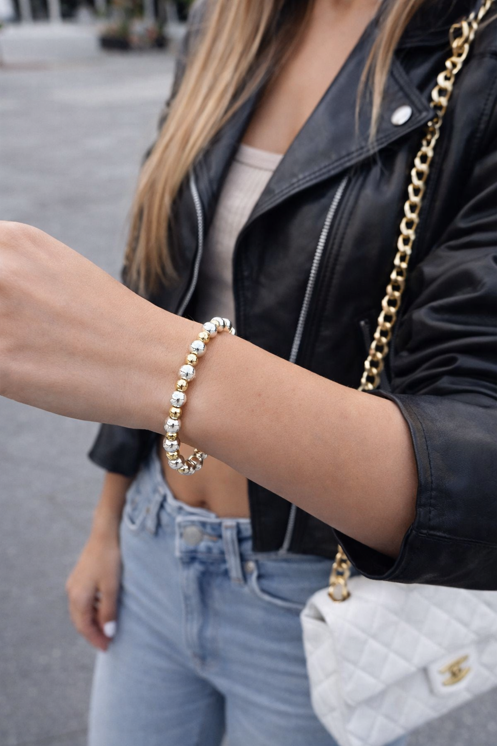 Deze armband combineert verfijning en contrast door het spel tussen 4mm goldplated kralen en 6mm silverplated kralen. De verschillende formaten zorgen voor een speels maar gebalanceerd geheel, terwijl de glanzende afwerking een luxe uitstraling geeft.